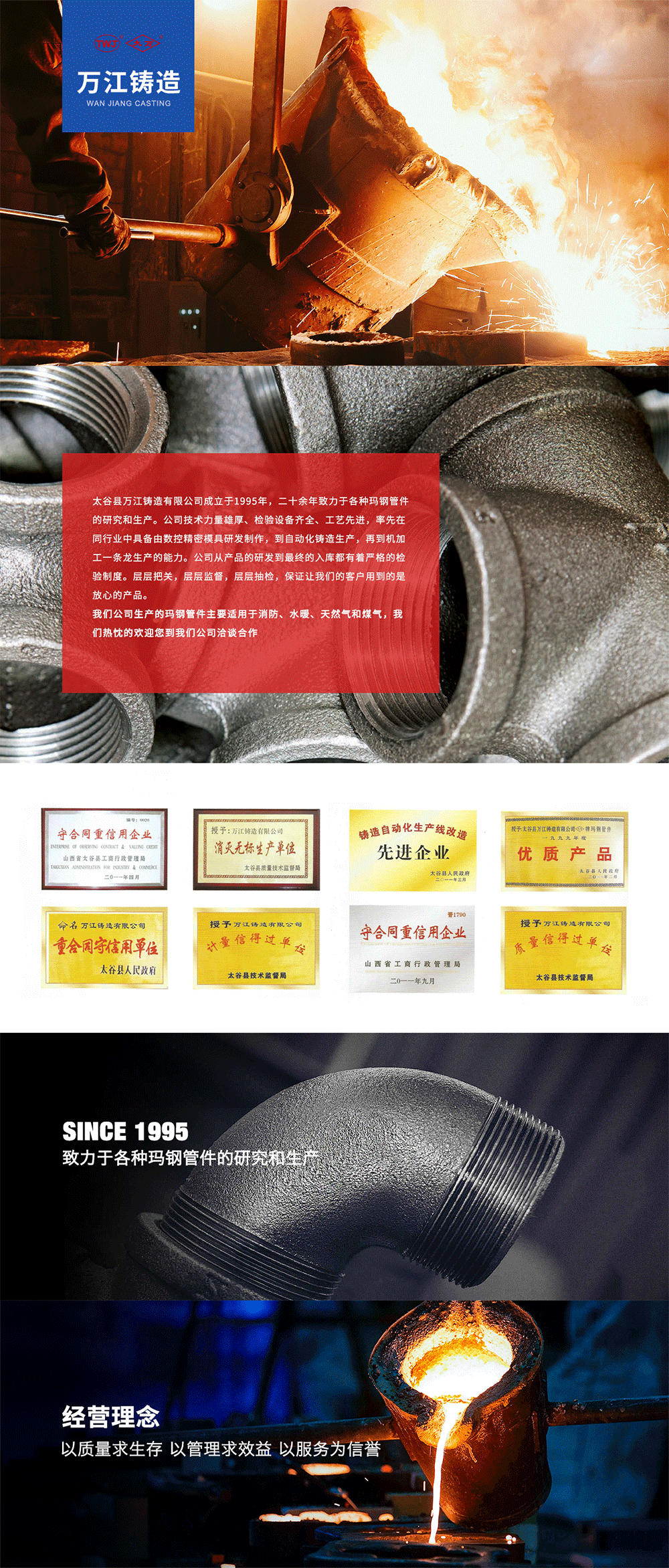 萬江鑄造成立于1995年,二十余年致力于各種瑪鋼管件的研究和生產(chǎn)。